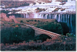 The Victoria Falls are one of the world's most spectacular waterfalls. The falls are situated on the Zambezi River, on the border between Zambia and Zimbabwe, and are roughly 1.7 km (1 mile) wide and 128 m (420 ft) high. They are considered a remarkable spectacle because of the peculiar narrow slot-like chasm into which the water falls, so one can view the falls face-on.