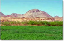 becomes a chain of long narrow pools on the sandy rock-strewn floor of the chasm. At the lower end of the Fish River Canyon, the hot springs resort of Ai-Ais provides an oasis in the desolate rocky wastes.