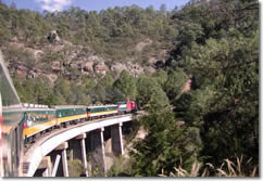 The train climbs to an elevation of more than 8,000 feet before descending to nearly sea level. This line took 111 years to complete due to the rugged terrain of the Sierra Madre Range and financial problems. More than 200 trestles/bridges and 87 tunnels were required to complete the task.
