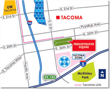 Ticket and merchandise pick-up will be at Freighthouse Square. From I-5 (North or South) Take exit 133 (I-705N, WA-7 S, City Center, take East 26th Street (Tacoma Dome) to the right, turn right onto E 26th Street, turn left onto E. D Street, From I-5 (North or South) Take exit 133 (I-705N, WA-7 S, City Center, take East 26 St. (Tacoma Dome) to the right, turn right onto E 26th Street, turn left onto E. D Street, turn right onto E. 25th Street. Free parking is available on the south front of Freighthouse Square, along East 25th Street and in the Tacoma Dome Station parking garage on East 25th street. There is also plenty of street parking available during evening hours.